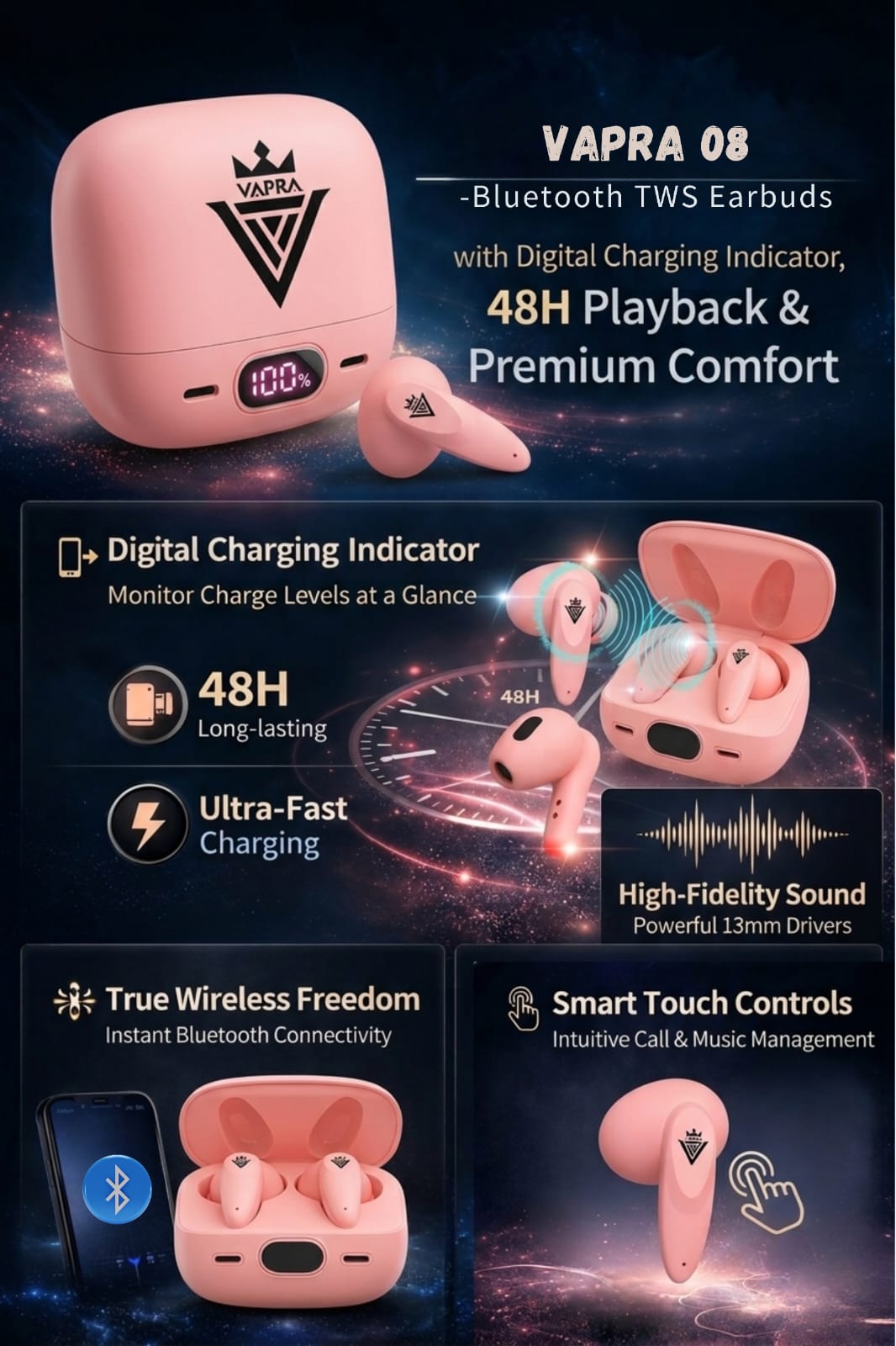 “VAPRA 08 TWS True Wireless Earbuds – Up to 48 Hours Playback | Charging Indicator LED | High-Fidelity Sound | Comfortable Fit” (ROSE PINK)