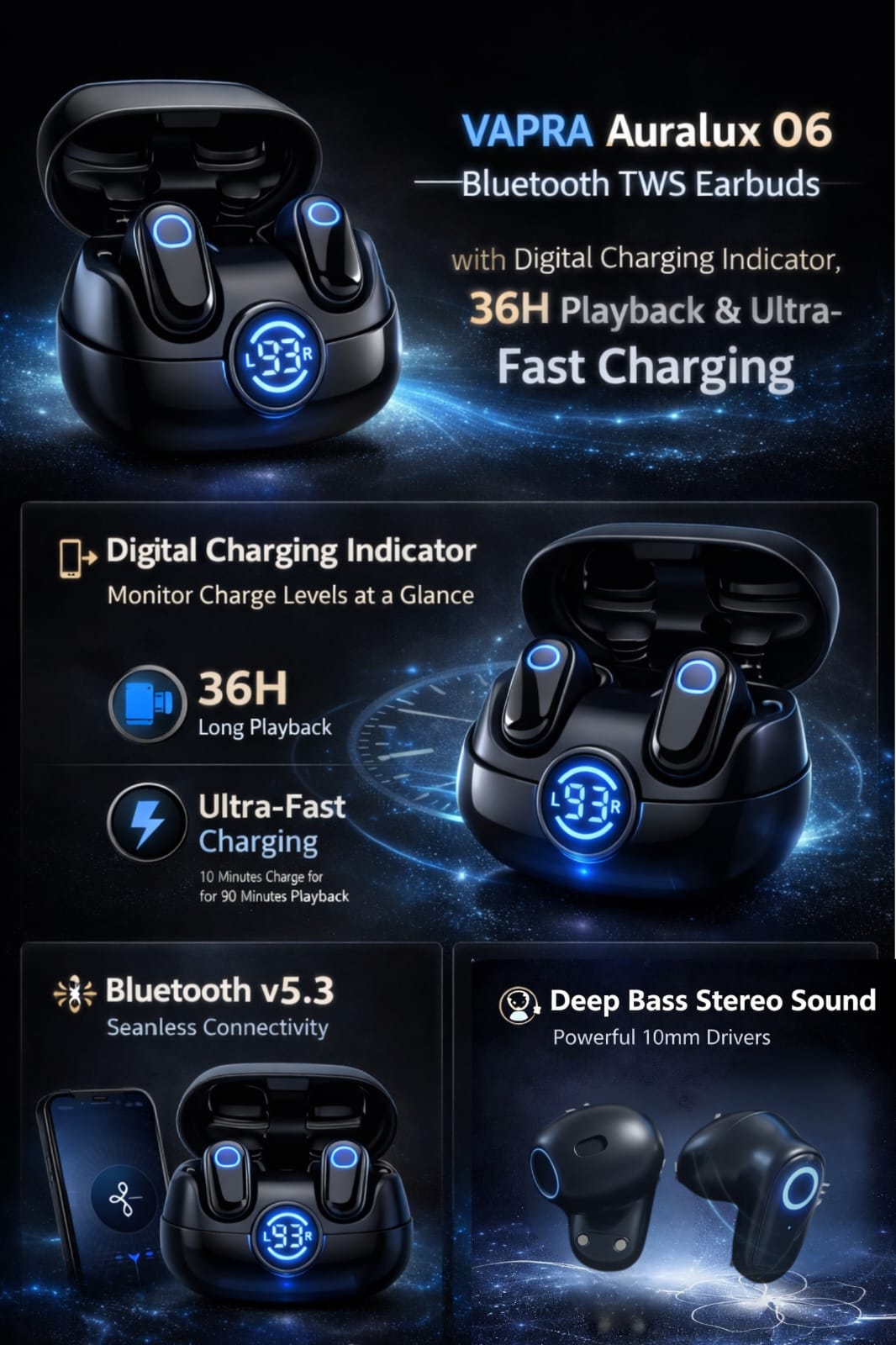 VAPRA Auralux 06 Bluetooth TWS Earbuds with Digital Charging Indicator, 36H Playback & Ultra-Fast Charging